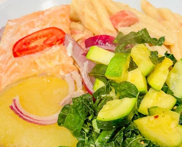 Pan-seared Atlantic salmon, delicately infused with lemon, tomato, and garlic butter, accompanied by golden potatoes and caramelized onions. Served alongside house-made almond cream pasta tossed with sun-ripened tomatoes, and a sauté of zucchini and kale finished with a whisper of butter and garlic, a refined home creation by Chef Zep.